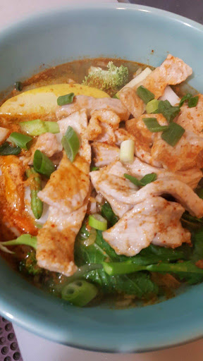 I had just moved back to the area and after driving by a few times my cousin and I wanted to check the place out. The atmosphere is alright and the people are very friendly. We ordered the coconut chicken wing and the Thai roll for appetizers along with a Thai tea. The tea was amazing, as out waitress stated, "it is as if having dessert b-4 dinner." The Thai roll was very good and the chicken wings were nice, a little heat. For dinner my cousin had a noodle bowl where as I had a stir-fry (red) Curry Chicken. The bowl was huge but it lacked a lot of flavor since the stock was without seasonings and did not taste as if it had been a true stock. The curry chicken stir-fry was very disappointing, as the chicken seemed to have been bliled and not stir fired. The chicken taste was not significant and was not hot. The dish had few vegetables and the sauce was week with curry. Maybe because we went there on Jan. 1, 2016 the food seemed to lack a lot. Although the girls were very nice, I feel they could be dressed more appropriately.