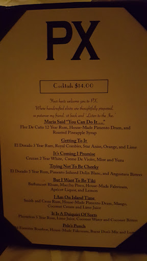 Drinks: AWESOME Food: AWESOME Staff: AWESOME Price: meh The PX is a wonderful speak easy in Alexandria (and one of the first of the new speak easy movements), complete with period decor, amazing food options, and FANTASTIC drinks. When you walk up to the non descript blue lamp you might find yourself wondering if you have come to the right place, step in and the waitress will walk you to your room (ps reserve -- its in your best interest otherwise you may be waiting by that lamp for a while). You immediately find yourself transported back into the 1920s. Light jazz music playing in the background, well dressed ladies taking your orders, beautiful period style decor. You immediately know you are in for an experience. Once you sit down dont let the cocktail list intimidate you, you are there to experience everything, so try something new and exciting -- I promise there was not ONE cocktail that I had that I didnt say "holy cr*p this is amazing." If you need a recommendation the waitress was well versed and knew the drinks and could help point you in the right direction! Before getting ahead of ourselves, I do believe its worth a mention that the drinks arent inexpensive, But it will force you to enjoy your drinks rather than gulp them down with merica fervor. As for the food...It was AMAZING. I have never had hor dourves that literally made my mouth water for more. My friends and I enjoyed a lot of their food options and not one was average -- everything was fantastic Finally, although there is no dress code, the place does recommend that you dress nicely and help keep the atmosphere classy -- think of the PX as an event more than a bar.
