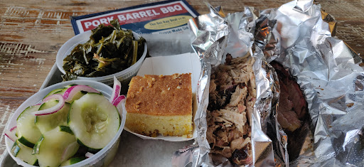 Unrealistic Expectations or just bad? First, Let me start with some context. I smoke my own meats and my main two are brisket and pork butts. I travel a lot so I have a smoker for the road and 3 at home. About a year ago, I wanted to do a brisket while I was in the DC area. I did not have any of my normal rubs, so I figured I would try something new. I stumbled across Pork Barrel BBQ rub and gave it a shot. We absolutely fell in love and its now a staple in my smokes. So, when I found out they had a restaurant here in the DC area, I knew we had to try it. Now for the review - We ordered 2 pick 2 plates and got Brisket and Pulled pork. For sides, we had the Mac & Cheese, Cole Slaw and BBQ beans. The meats in my opinion had technical issues, first for the cost 15$ per plate, we received about 1/4 lb of each meat. Barely a handful of pulled pork. When I opened the foil of the pork, I first noticed a glistening pearly white meat shining in the mid day sun. Red flag number 1, I know from my experience, during the pulling process the meat picks color from the bark. The other issue was about half the contents were pure unrendered globs of fat. Now, fat is normal, but if properly smoked and pulled it should have very little to no globs of fat. I pulled out a piece that was from the outer edge and tasted, absolutely no flavor. It felt like they boiled the pork and pulled it. I broke my own rule, I grabbed a BBQ sauce and smothered it. The sauce was not bad, but the meat should carry enough flavor to not require it. Ok, that was disappointing, but lets try the Brisket. Color was there, but it was clear there was no bark on the edges. Also, the fat was hard and would not scrape off with a fork. From a tenderness perspective, it was spot on and pulled apart very gently. However, the flavor was bland so out came the bbq sauce again. Sides, the Mac and Cheese was different and at first it was not that great. With in a few moments I noticed I had finished it. It was not bad, and somewhat addictive. The slaw was not good, I didnt get past a couple of bites. The seasoning they put in had an off putting flavor for me. The beans were amazing. Conclusion, I wont be back. After a year of using the rub in my own cooks I had a specific expectation in flavor. Knowing the owners are competitive BBQrs I expected the flavor to pop. But to have bland, boiled meat texture and flavor it was extremely disappointing. From a cost perspective, it was not horrible, if there was more meat. 2 slices of brisket and a small scoop of pork was a bit pitiful. I gave 2 stars due to the beans and flavor or the sauces. Again, if your bbq requires sauce, you are doing it wrong.