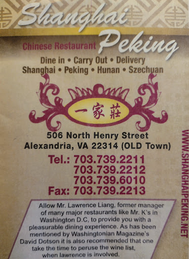 Ive lived here for four years and gave up on ever eating decent Chinese in Alexandria again...until Shanghai Peking. Ive probably gained 10 lbs since I discovered it. The service is great, the food is always consistent. I threw away all my other Chinese menus after Id ordered from SP twice.
