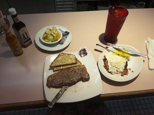 Food was very mediocre. Ordered steak and eggs and was not impressed. Seemed like someone just brushed the toast with the fake liquid butter stuff, potatoes were hardly seasoned as was the steak. They didnt even try to at least put some montreal steak seasoning on it or something. About the only thing right was the eggs. They served me water in a cup that was very chipped and pitted, it was kinda disgusting. Spoke very quickly, hard to understand, very pushy to take my order. After I finished my food, I sat there for 30 minutes looking for my server. I did want to order dessert, but not after that wait. The folks in the table behind me seemed to be receiving the same poor service as well. I finally got fed up and went to the counter, complained about the service and they really didnt even seem to care. Just nonchalantly said Im sorry, do you want something? Its as if theyve given up on even trying to provide good service and are just going to give free things instead. They claimed to be busy, restaurant wasnt even half full. Would not come back.
