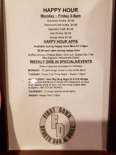 I dont have a lot of requirements for a sports bar. They need a decent selection of beer, many TVs, and good wings. First Down is a winner on all counts. Stop here if you want to catch a game and you are sure to find a like minded fan.