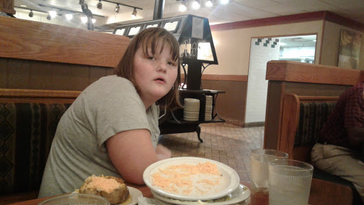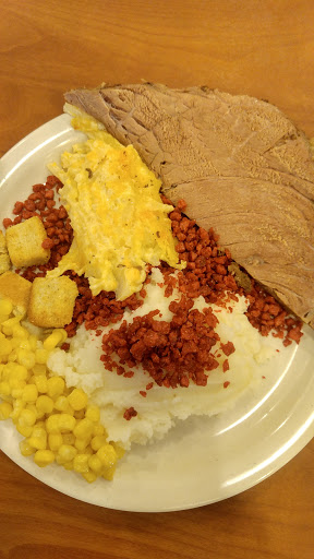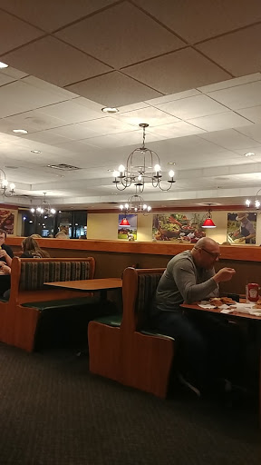 It wasnt the amazing buffet I remembered from my childhood (the sundae station only had chocolate and caramel sauces, and nuts and chocolate chips), but it was acceptable. Our steaks were cooked pretty close to as ordered-the thicker sirloins my friends got were perfectly rare, while my thinner ribeye was a little past rare, but not enough to bother sending it back. Beware tho, their "butter" is actually a margarine/butter mix, tho any given server might tell you its butter. Ours did, but then when I asked if she was sure, because it didnt taste right to me, said shed go check, and came back to report it was_not_pure butter. Also, the side order mushrooms were *terrible*. I dunno what they were cooked in, but they were so salty I couldnt eat mine, and they were horribly greasy. Fried chicken was good, as were the baked potatoes, and everything else we got off the buffet was good or at least fine. Overall, Golden Corral is cheaper, their sirloin is just as good (tho they dont have steaks besides sirloin), and they have more options on their buffet. The one thing I might pick Ponderosa over Golden Corral for is the drinks. As of Dec 2016, they have strawberry and blackberry syrups, which they can add to any soda. My strawberry pepsi was *delicious*. The check for 3 of us, 2 sirloins and a ribeye, buffet for everyone, a side of mushrooms each, and a drink each, was around $65 after tax, before tip. The ladies room was perfectly clean.