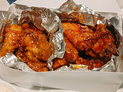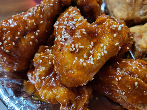 Nothing special, at least the spicy sauce is actually spicy. But what you get for 11 bucks is 9 pieces of chicken that are fried with no batter covered in samba olek. Of those 9 pieces 2 will be chicken ribs with no meat. Pass on this place and drive out to Fairfax Arlington or Annandale for Korean chicks.