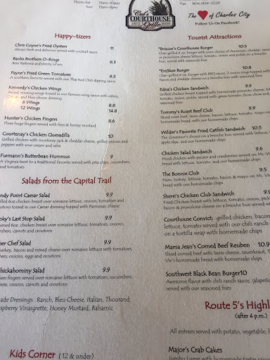 Found this restaurant online when looking for a place to eat in Charles City after touring Shirley Plantation. Even though the last review was very negative, we decided to give it a try. All I can say is we were totally impressed with our meal. Three of us had the grilled chicken sandwich with pimento cheese. The other one had the lobster bisque soup. They also shared an order of fried oysters. Since someone had recommended the coconut cake, we saved room and shared 2 pieces. We all agreed it was the best coconut cake we had ever eaten. We would definitely recommend Culs Courthouse Grille. Our waitress was very nice and we enjoyed visiting with the owner. Service was great and so was the iced tea!