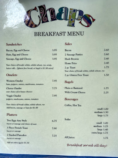 We enjoyed a delicious breakfast at Chaps! Omelette, eggs over easy, delicious home fries with onions and mushrooms, lots of coffee and wonderful service. Kim was our server and she was a hoot. Lots of banter back and forth and a really delightful lady. Sorry we didnt get back there on Sunday. We will be back to Chaps the next time we visit Charlottesville. What a beautiful place!