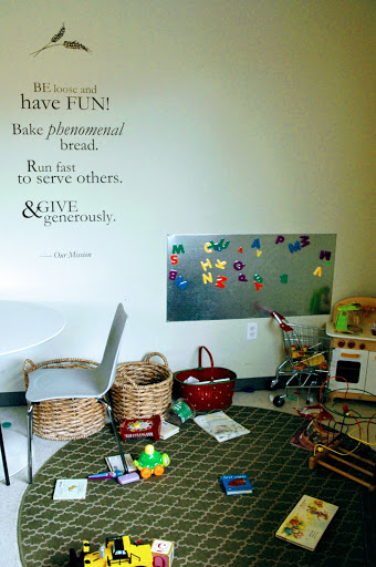 Wonderful bread with plentiful samples and a very nice corner for kids with a small play kitchen and a few baskets of toys that my 3 year old enjoys.