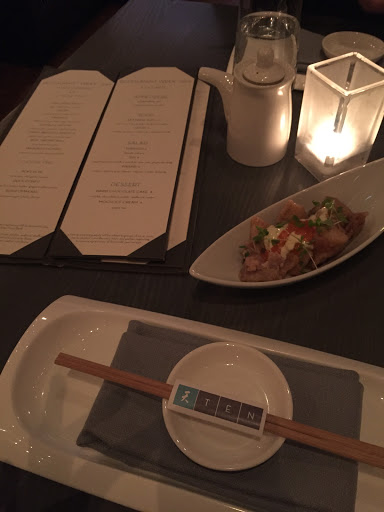 Ten is very upscale, memorable of higher end sushi restaurants in major metro areas like New York or Denver. While the presentation and food are very good, the restaurant was not on par with like priced experiences in major cities. The menu was certainly a difficult read, with many common items having new names, instead of the names used in most restaurants. We were told the food was served "tapas" style, which Im not sure I understand since tapas is a specific cuisine; I believe they meant that one orders as one goes, which one can do in at any sushi restaurant. We cut our dinner short as the first order of 3 items took nearly 30 minutes to arrive - had we continued at that pace it would have been a 2 1/2 hour meal. Nigori "Diamond Dust" sake was served at $17/glass, which is insane. 30 year old scotch goes for less than that. We left with a $100 tab (tip included) for 3 rolls, 4 salmon sashimi and two glasses of Sake. That would barely compute in New York City. It certainly doesnt compute in Charlottesville.