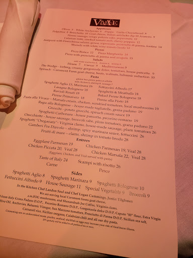 Food, Service, atmosphere, price, all great. We heard that it was under new ownership so a group of us went a few weeks ago and then we went back. It was great. We had a great antipasto and different chicken veal and shrimp dishes. We all agreed that finally Charlottesville has a good neighborhood Italian restaurant with good prices and excellent service