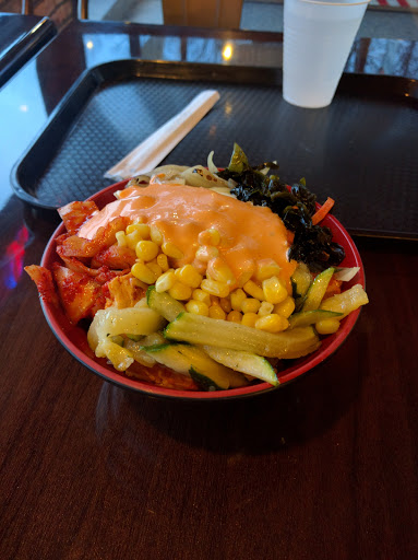 Korean food, freshly prepared with traditional vegetable options. This place is great, one of my favorites in Cville for a quick and cheap lunch. For newcomers, Id recommend the rice bowl (Bibimbap). You choose the rice, meat, optional egg, and six toppings - mostly vegetables, kim-chee, etc). They even have a cheaper kids sized bowl with 3 toppings for 5 bucks! The Korean Ramen bowl is also a great choice. Aside from the standard fare fountain drinks, they have a small beer selection including a couple craft beer items. Generally well kept and clean. My only grip is there is some serious resistance to the doors. But once you manage to get inside the building, the experience is pretty good.