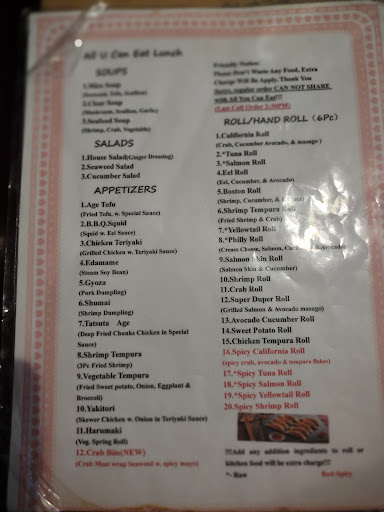 An all-you-can-eat experience. Feels authentic (read the menu). There is a wait time between meals. Only one chef when visited. Felt relaxed and calm just entering the room; very inviting and dimmed lighting. Best time to stop by is around 6 pm. Went in and came out 3 hours later feeling refreshed (not bloated). Try the Wasabi Roll--its a NEW menu item--its good! Our server remembered all of our orders (party of 4) and reminded us when we forgot.