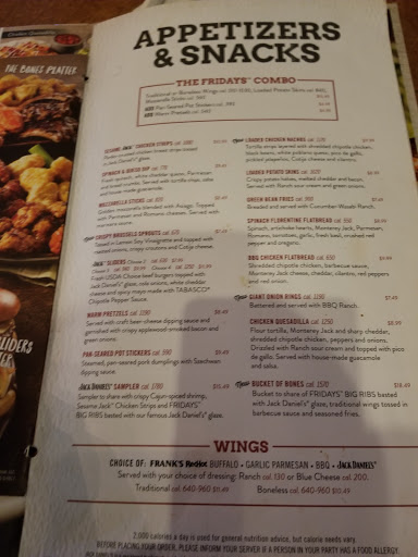Horrible. Went in on a Wednesday at noon. We were there for over 90 minutes. The place was empty. Our server had 1 table other than us. Refills took 20 minutes. No joke- we timed her. Two from our party ordered the endless appetizers. Each order took 20 minutes as well to come. No explanation or apology for the slow service. She was nice, just did not seem to care at all. No manager visible either which is not normal. I used to work for Fridays and there was always a manager on the floor. In sum, we will not be dining here again.