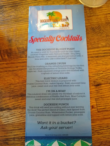 My family and I absolutely love Dockside! We have a house in Colonial Beach that we live in on the weekends in the summer and fall. Almost every Saturday night we go out to eat at Dockside! The owner (guy with the man bun, I have never caught his name) really took us in one night. We had been working on our house all day in the heat and by looking at us you could tell, we went to the restaurant at about 8:45 not knowing they closed at 9 p.m. We were denied entry by the bouncer, my dad turned around and said "looks like we are going to McDonalds, the owner spoke up and said "No, we cant allow that, come on in." It was a limited menu since they already closed the grill but it was still just as good! We have always had great service and food here! Its a awesome outdoor,beachy environment. They always have awesome bands playing and its great people watching! Lol. Highly recommend !