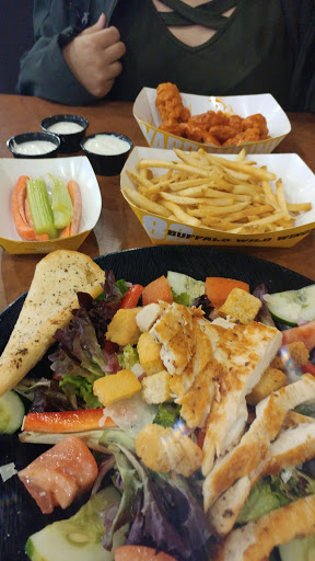 Food was typical Buffalo wild wings food nothing amazing but tastes good wasnt a fan of our appetizers but thats just me, otherwise the place was short staffed one girl was working the bar and bar section and was running like crazy, she did a great job just didnt have time to really be attentive to each table because there were so many, I will go back