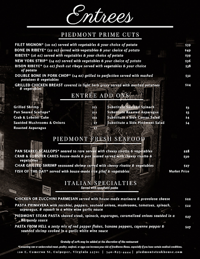 I absolutely LOVE downtown Culpeper and Piedmont steakhouse. They do an amazing job and their steaks are the best! Price is comparable for downtown Culpeper restaurants. Cozy and intimate feeling. We love to get a table by the fireplace. The service is amazing and they are well trained. 5 Star Restaurant for sure. Just wanted to make a review to set the record straight (after reading some of the other reviews). I am a Culpeper local that has eaten at Piedmont on multiple occasions (I have absolutely no payback for writing this or praising Piedmont Steakhouse, but wanted to share my opinion)