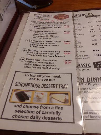 Uncle Elders is the unbelievably great. The homemade BBQ sauces are to die for! They offer pulled pork, chicken Bbq, brisket, steaks, great side dishes. The best BbQ I have ever had!