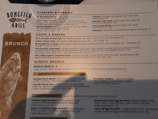 First time trying out Bonefish Grill. Over all the experience was pretty good. When walking into the restaurant my group was greeted by friendly staff and the server we had was pleasent and fun. The Bang bang shrimp was great, the fish tacos were very delicious and the grouper ( fish of the day) was nicely grilled and tasted good. Few complaints. We were asked if we liked some bread and never got received it after saying yes. also found it odd that they only offer a dinner service starting 4pm, its located in a fairly busy area I could see it being open for a lunch.