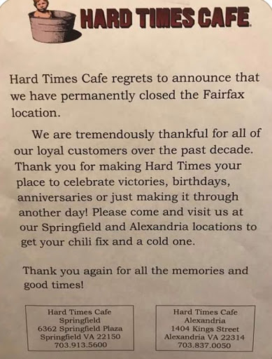 One of the few places in America where fascism does not reign. People who want to smoke are "allowed" to smoke!! I dont smoke myself but have always loved the smell of tobacco. Now it smells like freedom! Also, for some reason just about everything in Washington DC area closes at 8 pm. HTC open late. Reminds one of a better era. At Hard Times you can escspe the truly hard times of our contemporary sterile quasi totalitarian ultra-sensitive enviroMarxist culture.