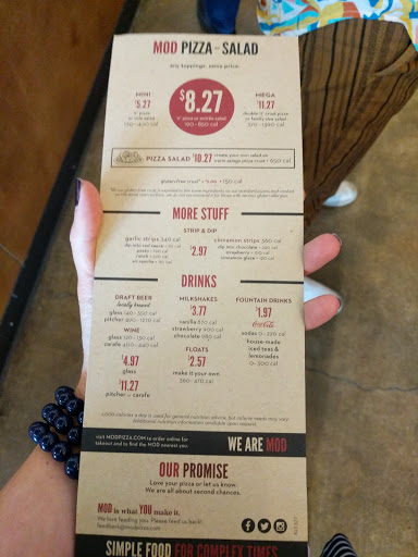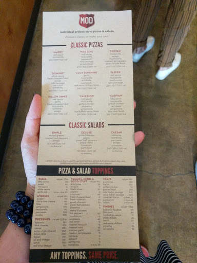 Superb customer service. This is always a go-to easy dinner option. You can tell all of the toppings are fresh and never running low. Also, in a part of town where parking is an issue, this Mod is located in a strip mall that has plenty of parking.