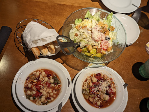 My husband and I enjoy eating at this particular Olive Garden, but it is either hit or miss lately. Eating in the actual restaurant, the service is always excellent , but, the last time we did take out , once home, we realized the meal was just terrible. The breadsticks were cold, the portion was extremely small for a chicken parmesan meal , the salads were only half sizes and there was no grated cheese and enclosed. Even the tiramisu we ordered for dessert, was dry. Telephoned the restaurant manager and they were happy to reimburse our money.