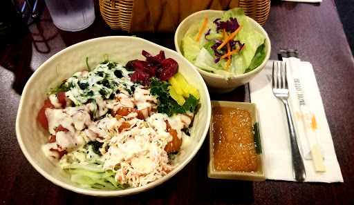 There are two sides to this restaurant: Sushi and Teppanyaki. The Sushi side is empty for a reason... The fish is old, discolored, and smells/tastes fishy. They have a Mon-Sat lunch sushi buffet, and our Friday night dinner tasted like the leftovers from lunch. The service was mediocre to match. The sushi came assembled on a boat, and the waitress couldnt identify the pieces for us (she had to get someone else, who then retrieved our order sheet and guessed to the best of her ability). Sadly, their version of anything spicy was a dollop of spicy mayo on top (this was true for the spicy California roll, spicy tuna roll, spicy yellowtail, and a special Maki roll that claimed to be spicy). Our party of 4 had a bill of $140 (we mistakenly ordered a lot). The best part of the meal was the veggie tempura (it was very good and fresh), the free miso soup, and the house hot saki (surprisingly good). If I went back, Id only do the Teppanyaki side of the restaurant. But Id sooner try another place then come here again.