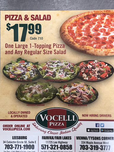 Best Pizza in Fairfax/Fair Lakes, Virgina We have been ordering takeout and delivery from Vocelli Pizza Fairfax for years.My wife loves Chicken Pesto Sandwich and Mediterranean salad.I always get buffloa chicken pizza. You can order food online.They usually have pizza deals/Coupons online. Best local pizza delivery/Italian Food in Fairfax VA. Way better than your average pizza parlor. This is our go-to place for delivery pizza.