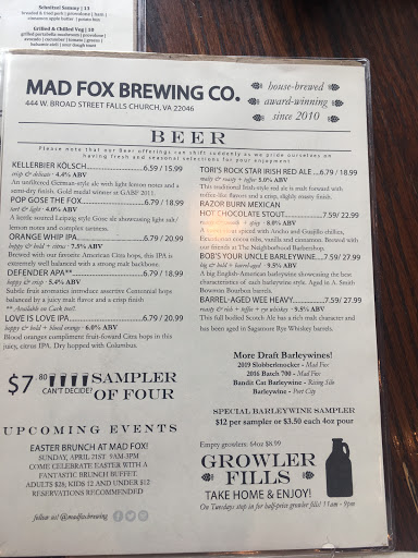 Went here for brunch this morning. Never been before, NEVER going back. My wife started out with a cup of coffee. After she stirred it, she licked the spoon, and suddenly got a shocked, sick look on her face. There was hardened, sticky food of some kind stuck on the spoon. The waitress had not just brought her a dirty spoon, she had brought her a spoon visibly covered with somebody elses food. When we pointed it out tot he waitress and asked for a new cup of coffee, she merely took it away and replaced it, without any comment or apology. THIS WAS THE HIGH POINT OF OUR MEAL!! My wife ordered eggs benedect, I ordered a pizza with several kinds of meat on it. The eggs were described on the menu as coming with "crispy pork belly." My wife specifically asked the waitress about this in advance, and was told this was kind of like a crispy bacon. When it arrived, the "crispy pork belly" turned out to be a not-fully cooked blob of slightly warm, gelatinous gooey fat, and the yolks on the poached eggs were cooked completely hard. She sent it back, and a while later the chef or manager came out with the new plate. This time the pork was crispy, but the entire dish was greasy. He came back a few minutes later to check if the replacement was OK, and told her they had a new chef on today. No apology, no other explanation, he just informed her the chef was new and took off. My pizza was so covered with and swimming in grease I asked the waitress for some paper napkins to blot up the grease. She brought a stack of napkins an inch thick, and I had to use the entire stack to blot the grease up from the pizza, and it was STILL greasy!! When the chef/manager was there to tell us a new chef had produced the first effort at my wifes eggs he HAD to have noticed a very large pile of soaken wet greasy napkins on the table covered with pizza grease, but he said not one word about that. My son ordered a "Mad Fox Burger," which was a fifteen dollar hamburger covered with "bacon jam," which turned out to be some kind of sweet bacon mush. Now, my 17 year old son is a bacon addict. He will eat bacon on anything, including ice cream. Even he couldnt stomach this greasy, mushy stuff. For the first time in his life he scraped what was alleged to be a "bacon " product off his food and tried to eat the burger plain. Again, this was quite a task, as this fifteen dollar brunch burger was still covered in and dripping with grease. To Mad Fox I would point out that the bacon cheeseburgers at the Sweetwater Tavern and the Carlyle in Shirlington (one of the best restaurants in the state) cost fourteen dollars, and honey, you aint no Carlyle! One might think that after a dining experience like this the manager, or at least the waitress, would come out to offer some kind of apology, explanation or remediation. One would be wrong. The check (for the full price) came out and was placed on the table without a word. The manager or chef (who KNEW there were problems with the meal) never came back to check on us, never attempted to make it right or apologize. It was like they realized it was a lost cause and just gave up and ignored us. Of course, by the time we got home all three of us suffered upset stomachs due to the greasy food. I realize this is a brew-pub, and frequently such places are known for the quality of their beer and not for their food. But when you charge the prices Mad Fox does, you have no right to bring out one dish of terrible food after another. If you choose to go there, beware!