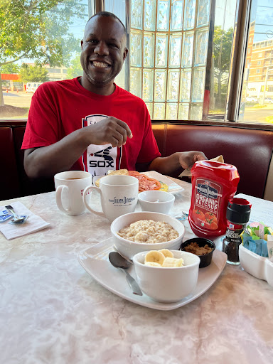 Been my go to spot for late night food. They serve breakfast item all day and their streak and eggs are great after my workout. For those that needs to track their caloric intake they also have great salad selections and lots of healthier options. Service has been prompt and friendly. Atmosphere is casual. Typical dinner look and feel.
