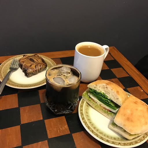 My girlfriend and I stumbled upon this place thanks to a recommendation by Google Maps. It was dreary and rainy out, so we wanted to get out of the cold and get some warm coffee in us. Little did we know, we were about to stumble into one of the most delightful little places that we have ever stumbled upon. Enough with the stumbling. We got here, and we ordered from the very nice front counter lady. We got a coffee, a butter coffee, a piece of carrot cake, a caprese sandwich, and a chocolate biscotti. The coffee was good. The butter coffee was a house made concoction of their coffee blended with butter to make their coffee creamier without having to add cream. It was very good. I got it with some vanilla flavoring, and I was able to drink it without adding creamer, which I usually do. The carrot cake was honestly the best purchased carrot cake I have ever eaten. I have a feeling it was made with vegan ingredients. They have a lot of vegan and dairy-free options here. But it was very rustic, with medium sized chunks of real carrots and walnuts in it. Superb. The caprese sandwich was nice, too. It was served on a big ol brioche roll, and there werent enough of a toppings-to-bread ratio, leaving the sandwich kind of dry as a whole. But the flavors were there. Finally, the chocolate biscotti was delicious. Their kitchen was on full display within the shop, and you could see them making the biscotti by hand. It was really kool. The atmosphere is what really earned this place five stars. The entire length of the shop is lined with used books that you can read while youre in store, and you can choose to buy them, too, if you want. There are board games, too, like Scrabble and chess and checkers and Apples to Apples. And my favorite part, every choice of seating was different. There was a normal four-person table, a bar, a nook dedicated to studying patrons, a couch, a larger table, a pair of comfy chairs, and a table that was the chess board that we played at. Basically, we lost time in there and had to come to our senses as to what time it was and go home. We could spend hours and hours in there, and we will return.