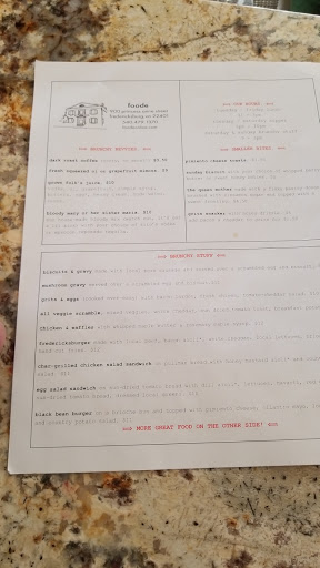 This is my first local guides review, and being a local in Fredericksburg for almost fourteen years has been interesting. Sure, its Americas hotspot for history buffs, but I just go downtown for the food. Case in point, FOODĒ. Located on 1006 Caroline St C / D, Fredericksburg, VA, I arrived there last Saturday for the very first time for a delicious brunch. Sporadic about their opening times depending on what day it is, I specifically came for a birthday brunch. Of course my birthday was at this time a week and a half ago but it didnt matter. Today I, along with my mother of whom was treating, would be dining on the award-winning dish of 2015 for Virginia: chicken and waffles! I wanted to be seated quickly, as I observed on the menu (to which an employee handed to patrons of whom waited in line outside the restaurant) that what I wanted to order was in limited quantity. Drizzled with pure maple syrup, the chicken was thick, succulent and tender as the waffles were quite fluffy, complementing the poultry quite excellently and washing it down with carrot and orange juice straight from a Mason jar simply made the whole ordeal an unforgettable brunch at that. The restaurant is cumbersome within, albeit its modern and hip in atmosphere, and I still have yet to taste some of their more outstanding food. FOODĒ is truly "gourmet for the rest of us", and as an aspiring epicure of all things quality, I am hoping to return, knowing they will not disappoint after the delectable and weighty dish that is chicken and waffles. IHOP offers the same thing on their menu, but has nothing on this serving of satisfactory soul food!