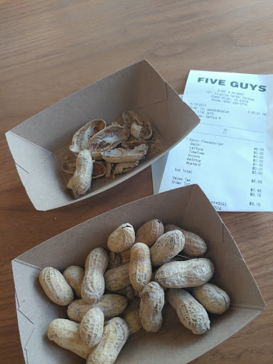 New, super-clean, very friendly location. Even has outside seating! Five Guys makes the best bacon cheeseburgers. Period. This is a typical location with seating, free peanuts, and a fairly efficient order processing line. Not the cheapest burger shop around, but in this case you truly get what you pay for in terms of quality, quantity and taste. Order large fries and see if you can actually eat the humongous bag full of fries that they give you. Store layout is tough... narrow space and not place for people waiting for orders to get out of the way of people trying to get a drink. Suggest that they move the drink machines a bit further down the alley, or just lose a table along the outside wall. 3/5/17 update: Have been to this location four times now, and can say that the service here is sloooooowwwww, as compared to the other dozen+ locations we have been to over the years. Maybe it is because they are still new and in training/learning? Slow register. Slow assembly. 20 minutes to get in & out with four orders in line in front of us, and two orders waiting. If they stay slow, will knock down a star on the review. Excellent.