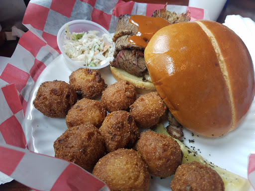 Our waitress was attentive and the food was good. The atmosphere and name suggest a bar scene but the fire house motif makes it kid friendly. If youre not a Carolina BBQ fan then you probably wont like the strong vinegar flavor of the pulled pork or the house pickles. My only complaint is that everything from the french fries to the brisket needed salt and pepper.