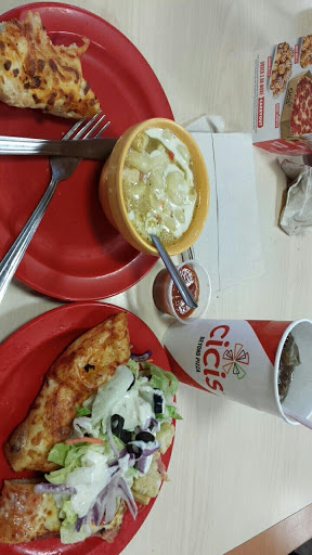 Compared with other Cicis, this location was below average. The staff walked around with a laissez-faire attitude and seemed to not understand their jobs. The buffet was poorly stocked even though there was only 4 families in...wait time for fresh pizza was longer than anticipated because the "cook" would just vanish! Food quality was sub par with little to no toppings. Finally asked the manager to clean the serving utensils because a little child, who recently sneezed into his hands, went pizza to pizza. Her response was that they clean them at the end of the night! SMH Cicis...way to be a buffet of germs! AVOID 5HIS PLACE AT ALL COST!!!