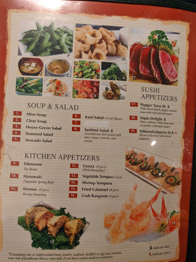 If you havent been here yet and you like sushi- you need to try it!!! Its a sit still buffet. Basically you pay a flat fee ($16.99 per adult) and you get a menu with over 100 options. Appetizers, soups, salads, sushi, hibachi items and desserts. You pick what you want and they keep bringing it fresh to the table until you say your done. All they ask is that you actually wat what you order (being wasteful will cost you extra). The good thing is that they dont care if your sharing plates with everyone at your table. Its a great way to try different dishes and sushis your not familiar with. Ive been twice now and dont have any complaints. Oh- and you cant take things with you (like a to go box- like most buffets). :) enjoy!!