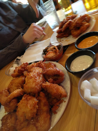 Great Korean BBQ chicken. Super spicy, and their other dishes are good too. If youre with a group, go ahead and just order a large plate of wings and split the bill, its cheaper than getting individual dishes.