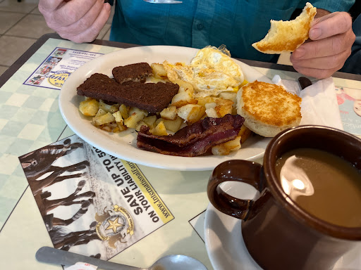 Friendly service, good hash and eggs, reasonable sausage, pecan pie wasnt great a little stale. Would return to try the homemade bread pudding though. But overall independent diner beats fast food chain every time