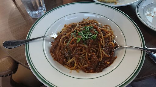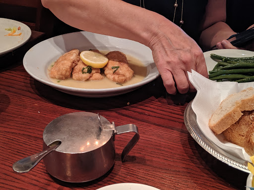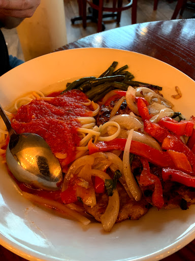 Service good, no bathroom upstairs, no white paper napkins was given Brown napkins were given that are used in a bathroom, poor parking, clams served in the Shell - what a mess trying to get clams out of the Shell. Will never order again. Red sauce all over my shirt, second beer served in a bottle - no cold mug provided, table kept moving on the floor every few minutes. Food was great