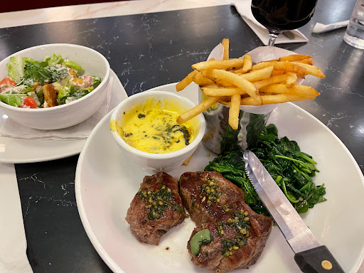 The waitress barely spoke english. There was 7 of us and she was highly confused taking orders. They jammed us into a booth that fit 4 comfortably. The wines we ordered were incorrect. Side salads were forgotten. I ordered the salmon and lentils and it was tastless and dry. I think the lentils and slop that came with the salmon was just extra crap thrown together in the kitchen. I came back and vommitted about 20 minutes after eating. Would not recommend.