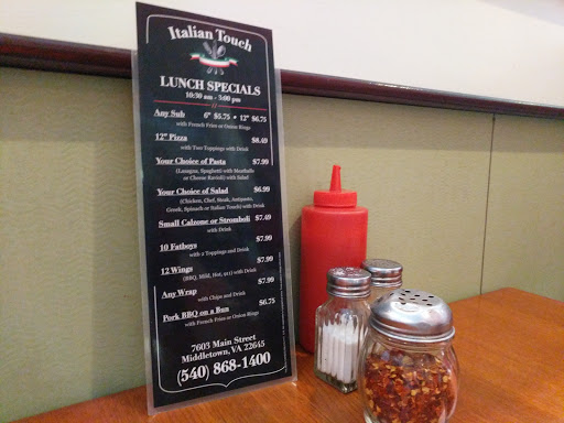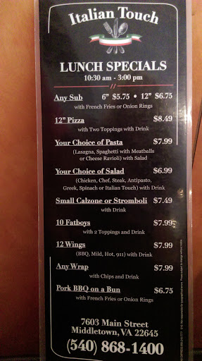 I had the lunch special of speghetti with meatballs and side salad. The side salad was ALL iceburg lettace plus a handful of mushrooms and tomatoes (very plain indeed! No flavor whatsoever even with the "Italian" dressing. The speghettti was boring boring boring! the sauce was very thin. The meatballs tasted like the frozen kind I can find in the grocery store...............Now let me tell you about the dinner roles.................boring, white, no flavor! Wheres the garlic bread? Wheres the homemade speghetti sauce? the homemade meatballs? Sorry, but wheres the Italian Touch?