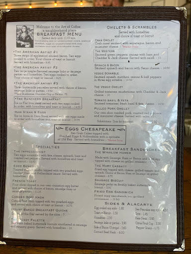 This place was great! Maybe the coffee is a little pricey, but no more than Starbucks and the quality is much better. Their breakfasts are reasonably priced, all under ten bucks, and delicious! We had the chipped beef on toast and the crab omelette! Cozy atmosphere to boot and lots of neat local artists and crafts for sale.