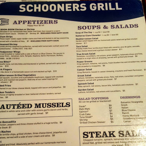 I do not drink alcoholic drinks but I do so enjoy the food and salads at Schooners. Our server is George he is super nice. My friend Sheila and I come here for the good food.