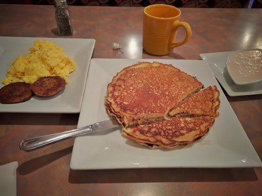 My husband had fluffy large pancakes, eggs and patty sausage delicious! I had a biscuit with chorizo gravy, which is light brown not heavy with cream, so not as thick as common gravy but the taste delicious...just enough heat, not too little not too much. Had it with an egg over medium. If I lived here wed be back often. Very casual and pleasant.