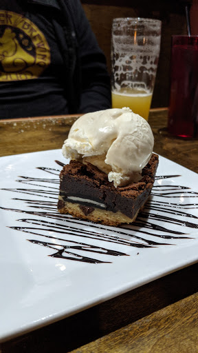My first time at this place as Ive heard good recommendations from friends and we were in that ... just a burger mood! Ambiance: good - lots of seating throughout the restaurant and a large bar with lots of TVs. Beer selection: also good - not a lot of wheat selections like I like, but I found something that works Service: our server was great - friendly, attentive enough, but not overly Menu: overwhelming! Sometimes, when you want a burger, you just want something simple. They have SO many choices, but for someone thats looking for out of the box, Im all about it. I had the redneck wellington, which is a burger wrapped in phyllo like a beef wellington - no bun. I was told that since they bake it this way, it would come out pretty pink in the center. I usually order medium, so I was good with this. When it came out, no pink. More well done. Got the fries on the side - inlet style - tasty. And ordered one of the 25 cent extra dips on the side with horseradish - that was good. Shared pickle chips to start - tasted good with the sauce, but that was a huge order for 2 people - ended up wasting. Also got a side of the roasted beets with tzatziki - yum!! Got the brownie/cookie with ice cream on top to finish it off. Overall, a good experience and would return.... to try one of the other hundred burgers on the menu ;)