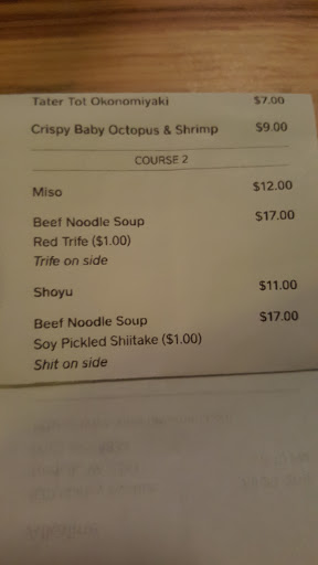The servers likes to commit fraud apparently. I left a $4 cash tip on a $14 bill, and she still added her own tip of $3 on my card when I specifically wrote $0, because why not? Not to mention, every time Ive been, except once, my noodles were very undercooked. Im Japanese...... Ive had authentic ramen many times before...... These were not cooked noodles.