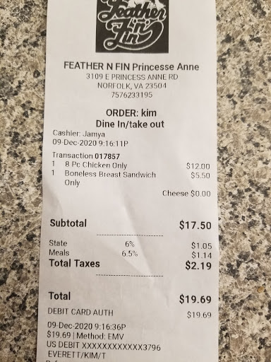 Just wanted to say thankyou for that awesome food omg I came down here for the holidays and my brother always said if you ever come to va go to feather and fin so Lastnight I did and its not like any other chicken joint either there was actually good customer service the front counter person greeted me and when I needed Alittle asstience she told called her manger which I appreciated her stoping what she was doing to help considering it was very busy in there I believe her name was breyona anyways she even handle the crowd good while keeping all focus on me when I received my food it was hot it looked so good I had to taste it before I drove off so props for great food good cashiers and an excellent manger will be coming back for more of a 4 Piece with potato salad and them good old bake Beens yall rolls almost taste as good as ah Hawaiian roll