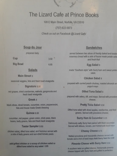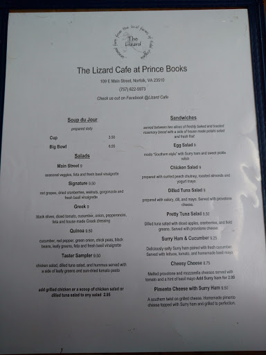A hidden gem. I had a turkey avocado sandwich, and it was one of the best sandwiches Ive ever had. Made to order with fresh, artisan frenchbread, and plenty of turkey. Came with a side of excellent potato salad. A superb, friendly cafe with great food and prompt friendly service. Its in the downtown area of Norfolk, and a 3 minute walk from both the Nauticus museum and the Waterside center. (Prince bookstore--another hidden gem--shares the floorspace, so you can buy a book and read while having lunch or coffee.)