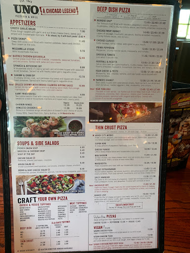 Horrible.... I was hoping for so much better. We ordered 2 drinks to start off with, then ordered soup and Cheese sticks. We received our soup and cheese sticks well before our drinks made it to our table. The cheese sticks were bland at best. I spoke to manger and he promptly retrieved our drinks... A bit late but good on him. Then our meal came out. I ordered a large deep dish pizza and my buddy ordered a large thin crust pizza. I had 4 toppings on my pizza and he had two. Needless to say, my large deep dish was as big as a personnel pizza from Pizza Hut and the sauce had no good flavor. I felt like I was eating tomatoes straight from a can. My buddy asked for a refill on his Pepsi and 15 minutes later he still did not have it. I got up and walk directly to the manger and told him we were done, please bring our check and to go boxes. He did. With the bland cheese sticks, one jack and coke and one beer and one Pepsi, a salad and a soup, bill was $82.00. Our server Kylie was friendly at first but after first talk with manger she was very unpleasant and not a good server. I hate to talk bad about server due to it not their fault a lot of the times but a good attitude goes a long ways. Nothing deducted for the ultimate poor service. I will not return to this UNO. As I sat and listened, we were by far not the only people complaining about their experience. Hope this review helps some. Jeff Meguiar.