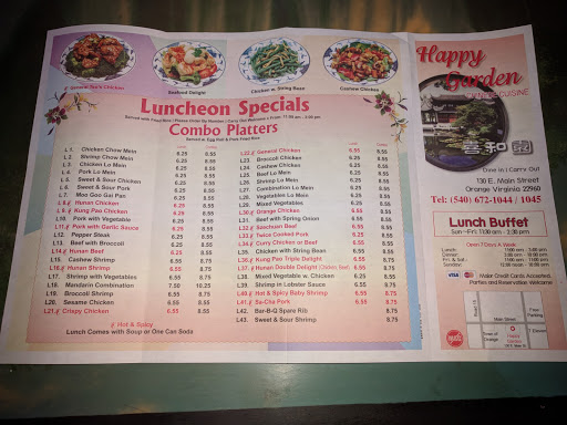 Three buddies and I went on a weekend camping trip to get away from the hustle and bustle of Washington, DC. Surprisingly, on a Saturday night in Orange, VA not much was open so we wandered over to Happy Gardens. Given the fact that this is a random Chinese restaurant in the middle of nowhere Virginia, we did not have great expectations. The atmosphere was classic cheesy, but the man (Jimmy) who owns it is so nice (hence the two stars v. one star). Between the four of us, we ordered four dishes and it was more than enough for four grown men. It was not the best Chinese food, but still edible.
