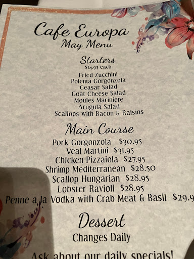 Cafe Europa is a fine restaurant, tastefully appointed and attractive in ambiance. The wait staff is very attentive and friendly, makes us feel comfortable there. So far, the food we tried are excellent and have never been disappointed. We used to love "Painted Lady" in Norfolk. Finally, we are ready to give our endorsement and say, Cafe Europa has become our favorite restaurant that we can depend on for our night out for great food and service.