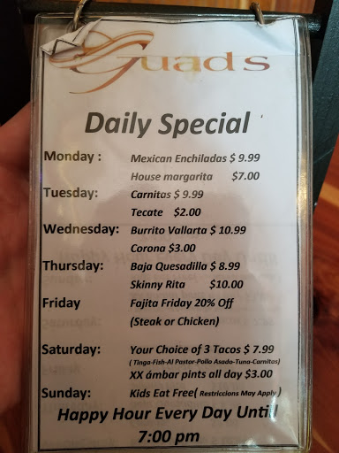Tried Guads out on a whim, and Im glad I did. I was immediately greeted by an energetic, smiling manager, who immediately took my drink order. I asked about their tshirts, and he brought the entire selection to my part of the bar. The waiter that helped me immediately informed me of their special, the Carnitas, which I ordered after looking over their creative menu. The Carnitas were cooked just right, still hot, and came with a delightful grilled veggie medley, which included a whole jalapeno (something I usually have to ask for), refried beans, rice, and tortillas. It was overall a great dining experience, I recommend it and will be back.